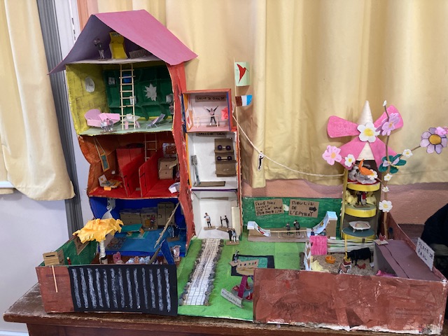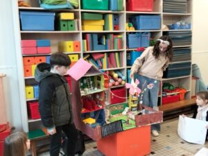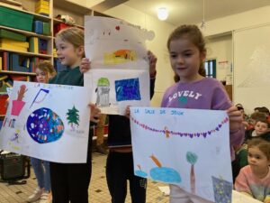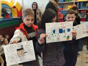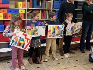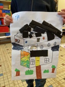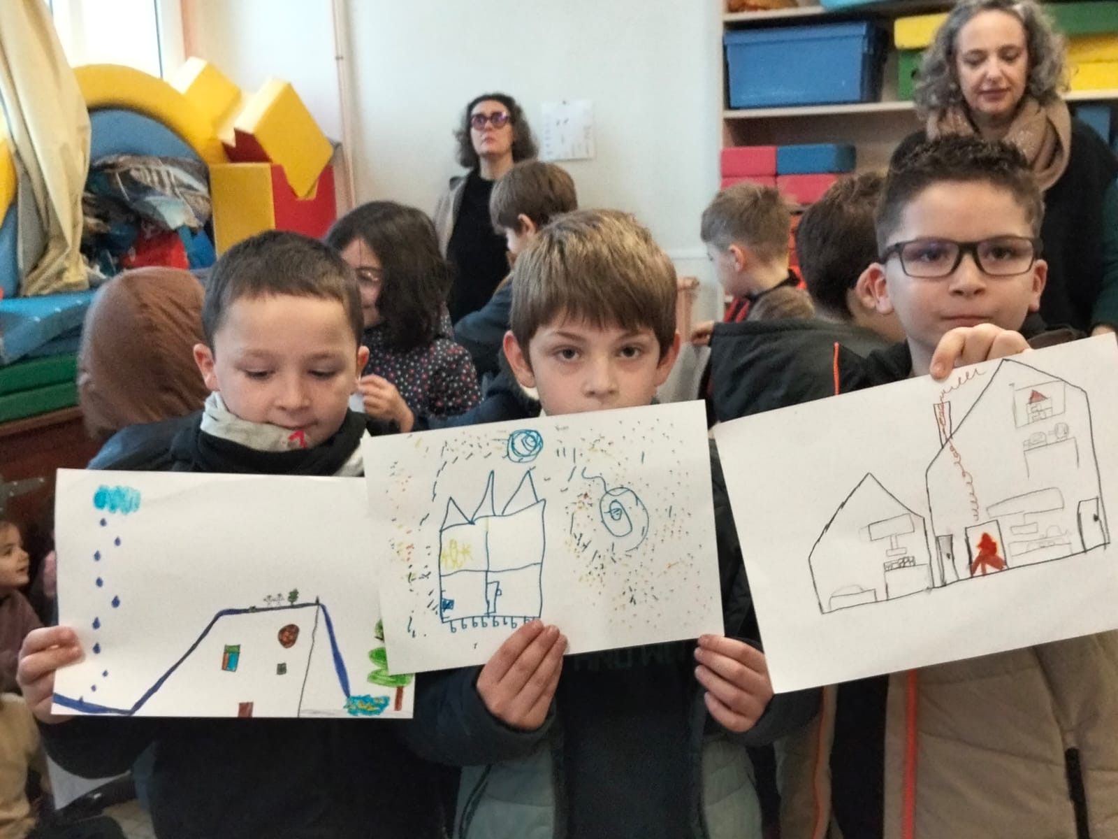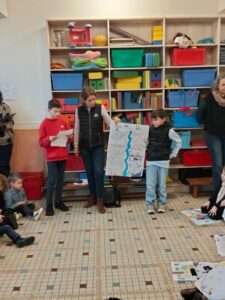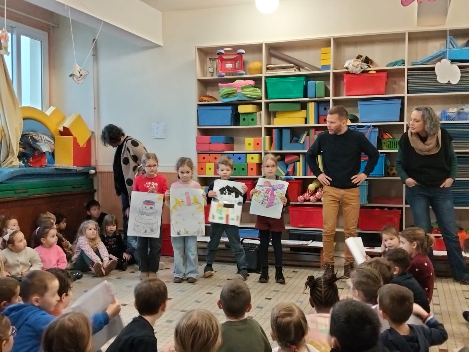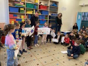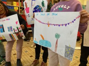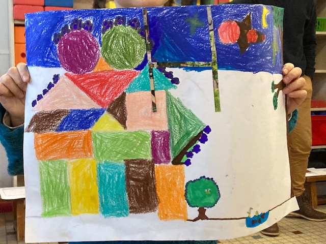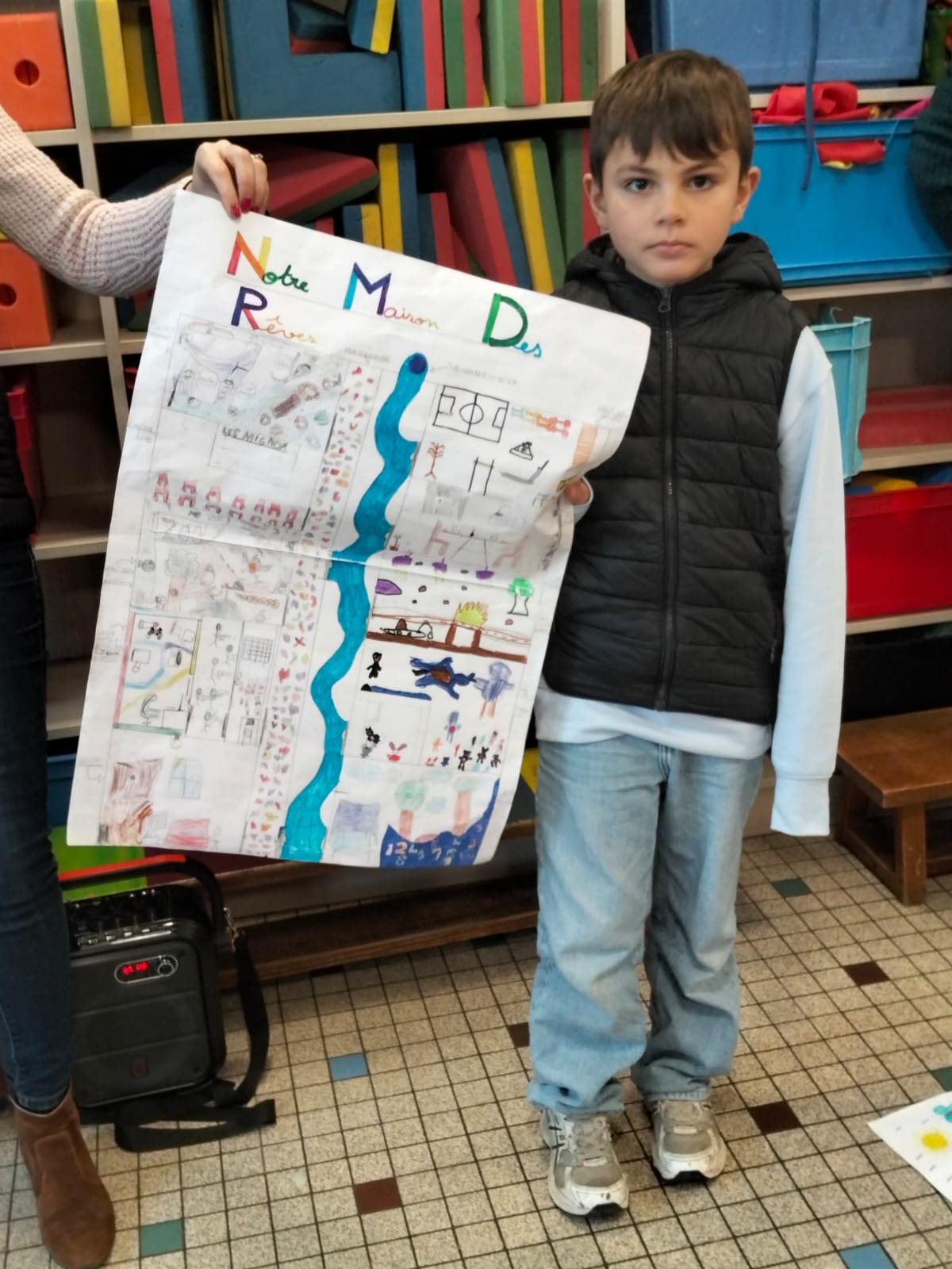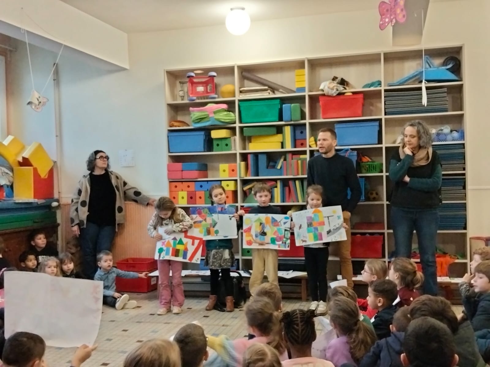 Le vendredi 13 février au matin, juste avant les vacances, nous nous sommes rassemblés en école pour une assemblée d’élèves. L’objectif était de « faire tribu », mais aussi de présenter ce que nous avions travaillé dans chaque classe, en lien avec la maison de nos rêves ou bien les pièces de la maison. Ce travail était lié à notre projet pédagogique autour du langage et des arts, une manière plus simple d’ouvrir les enfants à l’architecture.